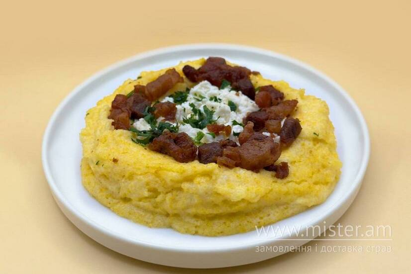 Спробуйте традиційний український банош — це справжня гастрономічна насолода! Ніжна кукурудзяна крупа вариться до кремової консистенції, а потім щедро посипається ароматною бринзою, яка надає страві неповторного смаку. Хрусткі шкварки додають пікантності та соковитості, а свіжозрізана зелень підкреслює яскравість смаків. Ця страва перенесе вас у затишну атмосферу карпатських гір, де кожен укус — це спогад про домашній затишок!