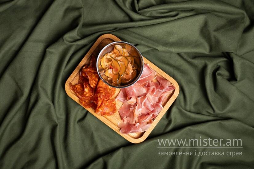 Антіпасті з прошуто, гострим чорізо та хрусткими огірочками пеколіно.