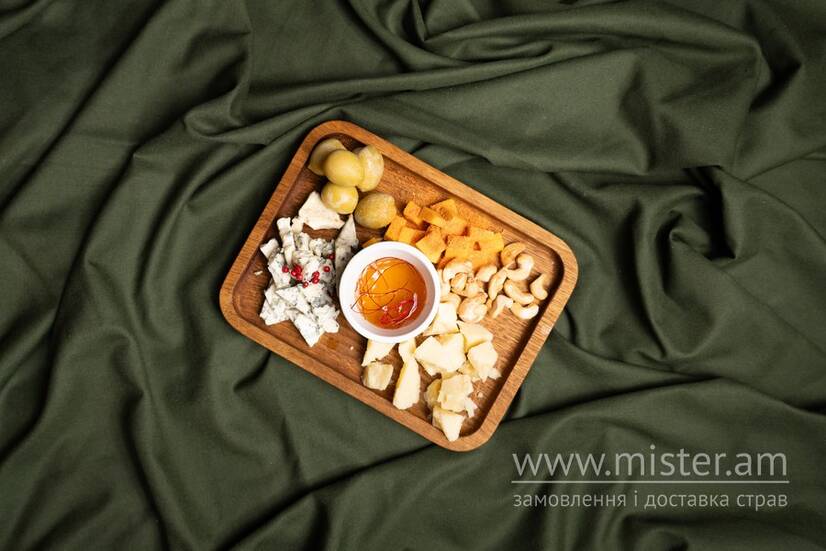 Антіпасті з добірними сирами: дорблю, чедером і пармезаном. Доповнена оливками, доповнена кешю та медом із легкою ноткою чилі.