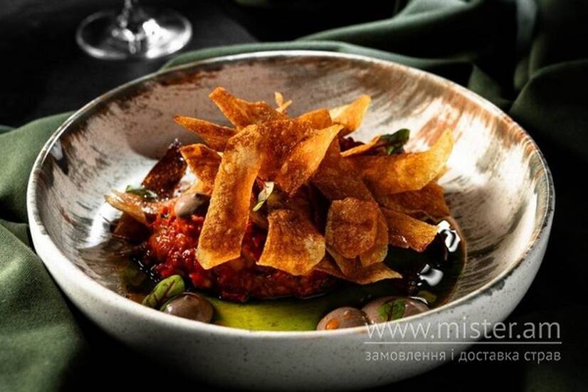 Айолі з ферментованого часнику, соус на основі печеного перцю та квашеного помідора, свіжий огірок, цибуля, петрушка та картопляні чіпси.