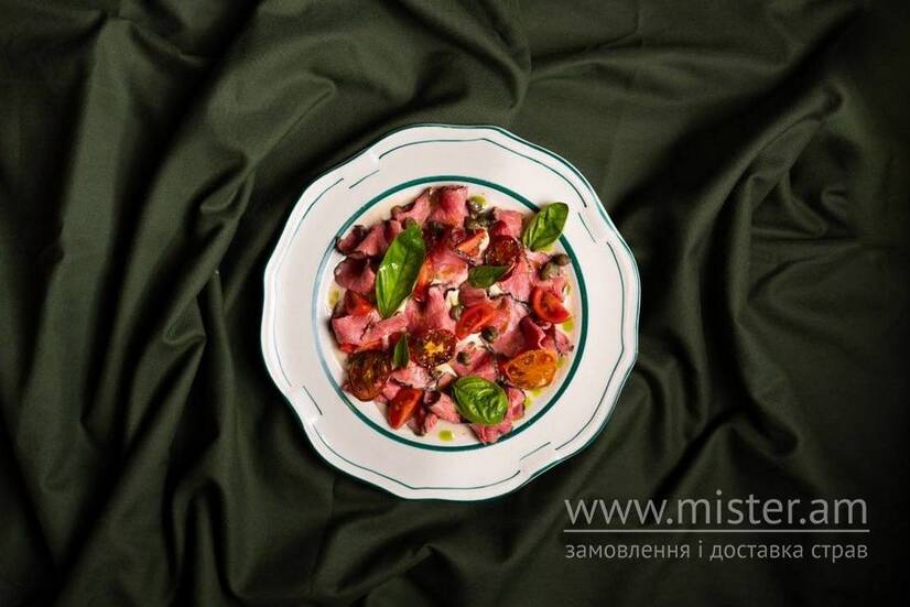 Наша інтерпритація на усіма улюблену закуску. Розстбіф, каперси, томати, песто, мікс салату, заправка віттело тоннато.