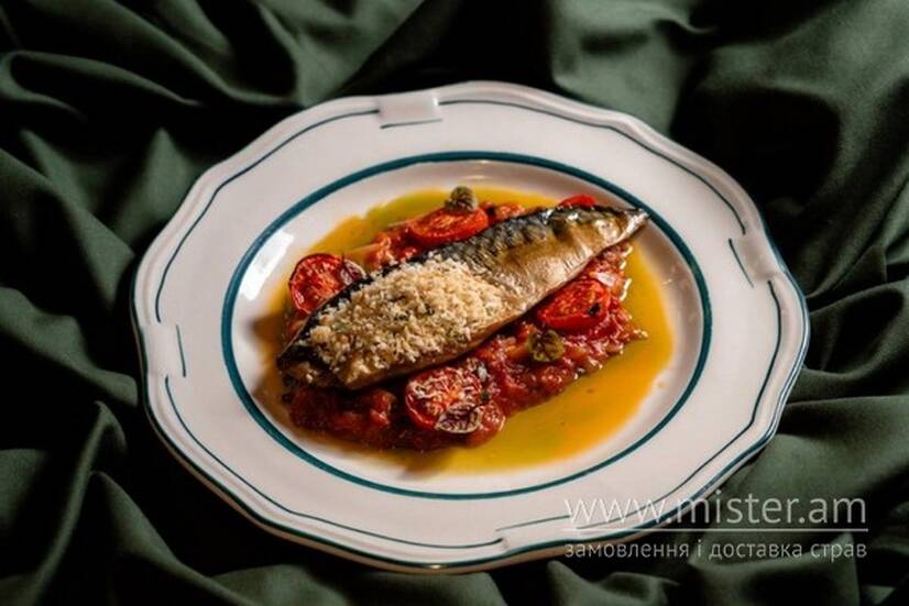 В ароматній овочевій сальсі з порею, селерою, чері, маслинами, анчоусами та пелаті. Завершується хрусткою панко-крихтою з цедрою лимона та базиліком.