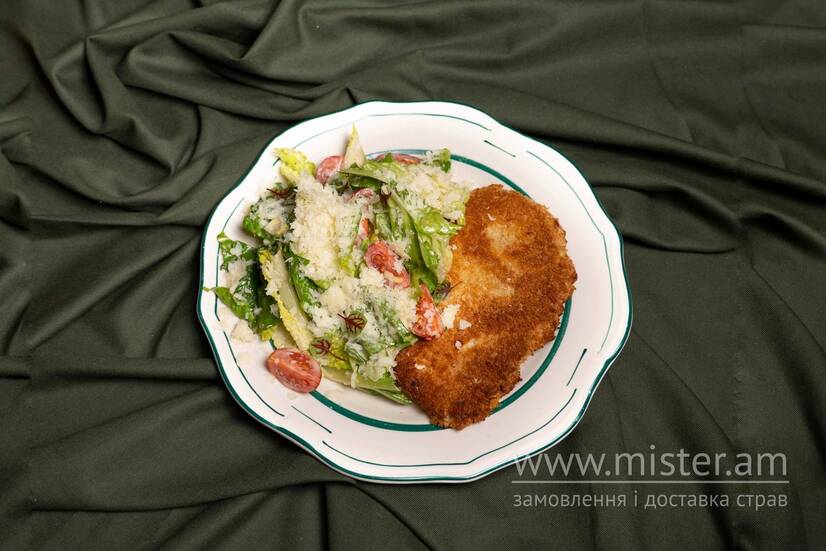 Соковите куряче філе у хрусткій паніровці панко, подається з салатом ромен і томатами чері. Заправляється класичним соусом Цезар та доповнюється пармезаном.