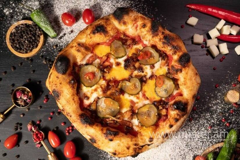 Піца на томатній основі з печеним беконом, моцареллою та сиром чедер, подається з компресованими маринованими гоструватими огірками.