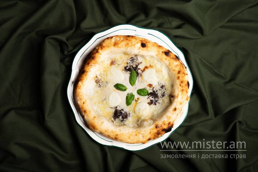 Піца на вершковій основі з додаванням моцарелли, чедеру, горгонзоли та рікотти, карамелізованої синьої цибулі з тим`яном.