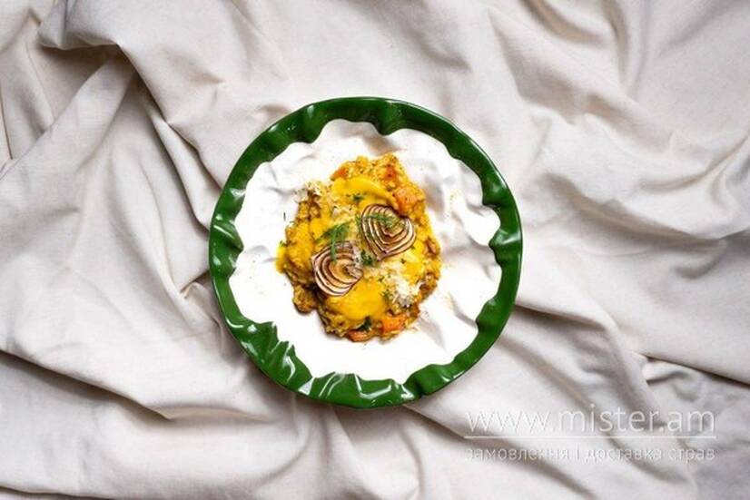 Білими грибами, трюфельною пастою, пармезоном та чіпсами з цибулі.
