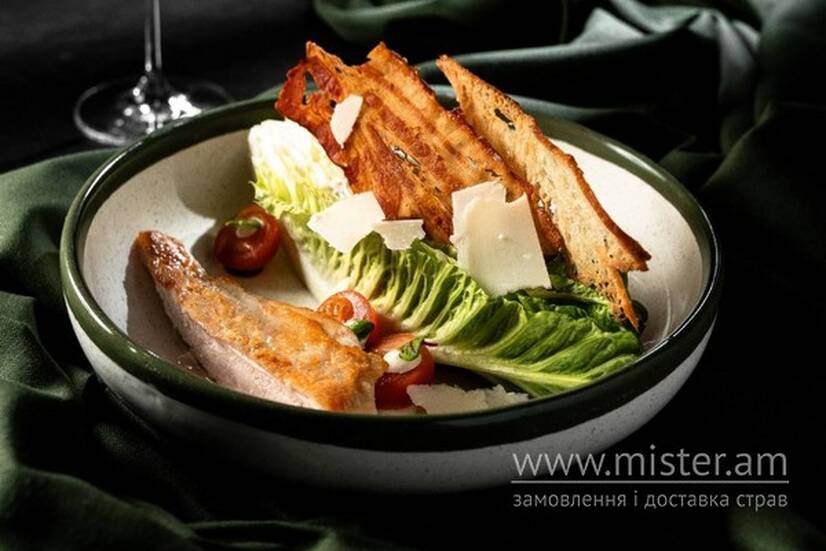 З курячим філе на шкірі, салатом ромен, чіпсами з бекону, томатами чері і пармезаном.