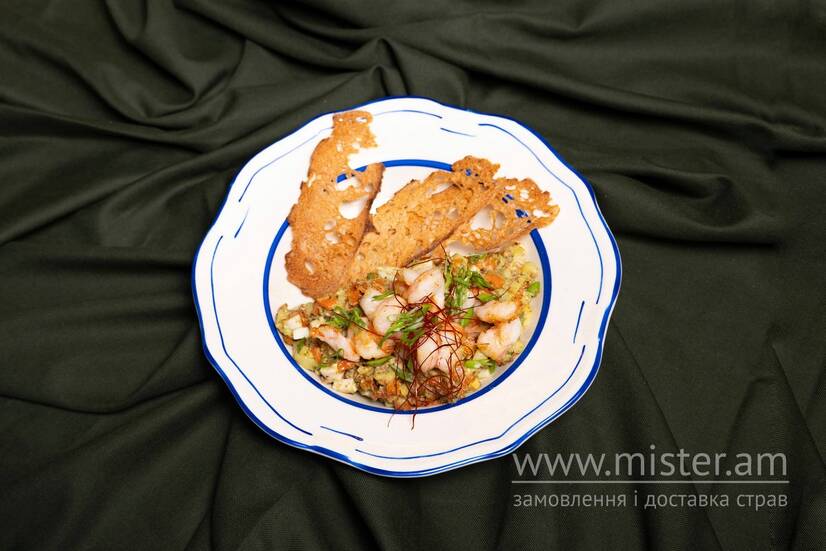 Сучасна версія класики з морським акцентом: картопля та морква у поєднанні з соковитими креветками, яйцем і в’яленими томатами. Заправляється соусами Цезар та песто. Подається з хрумкою чіпсою з багета, декорується нитками чилі та зеленою цибулею.