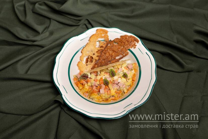 Авторська інтерпретація класики: ніжна мортадела, картопля, морква, мариновані огірки та яйце, заправлені кремовим соусом Цезар. Подається з хрумкою чіпсою з багета та витонченою чіпсою з пармезану.