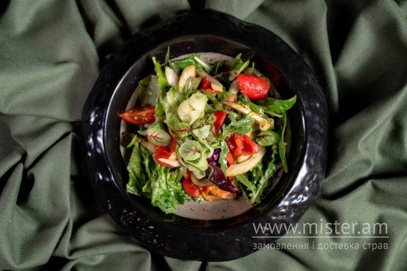 З болгарським перцем, томатами чері та пелаті, тальятеле з огірка, міксом салату та соусом песто.