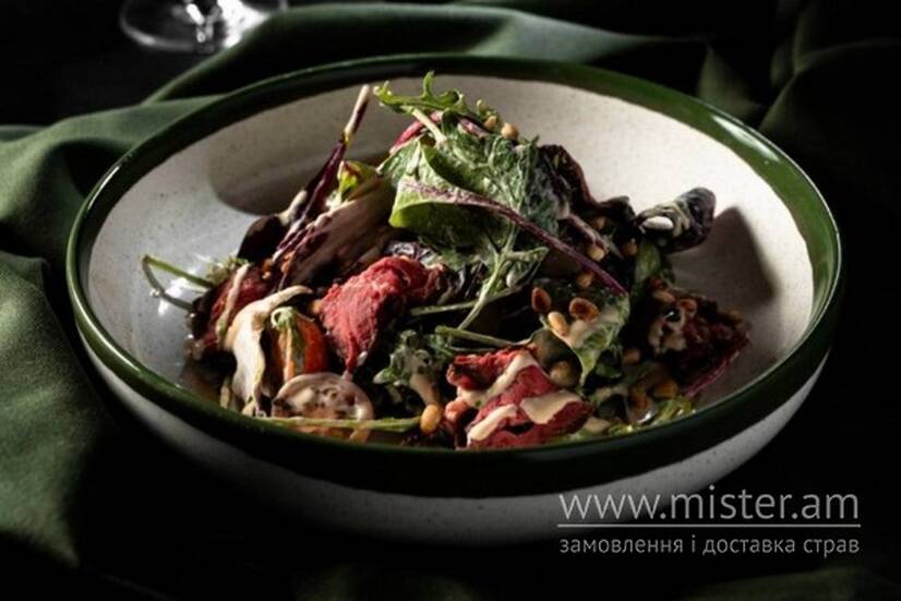 Мікс салат, соус на основі вершків та дорблю, ростбіф су-від, помідор чері та кедровий горіх.