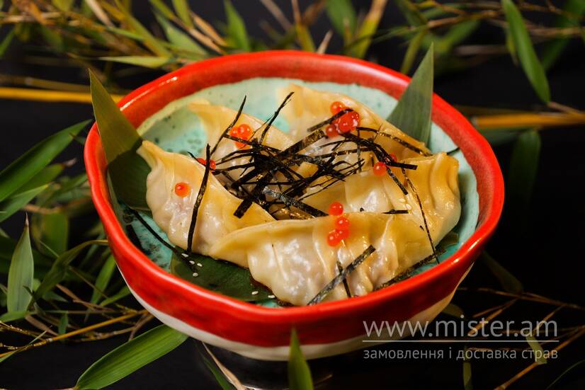 Традиційні японські пельмені з лососем та креветкою. Подаються з піною із соєвого соусу, перцю чилі та кунжутної олії, а також норі та ікурою.