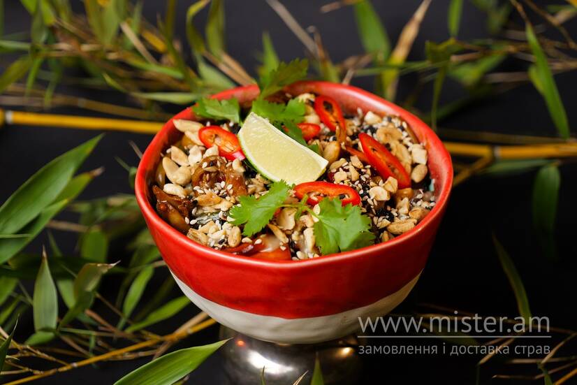 Локшина удон/соба на вибір, свинина, мікс овочів, соєвий соус, мірін, соус чилі-часник, світ чилі, спайсі масло, кунжут, горіховий соус, арахіс, зелень, лайм.