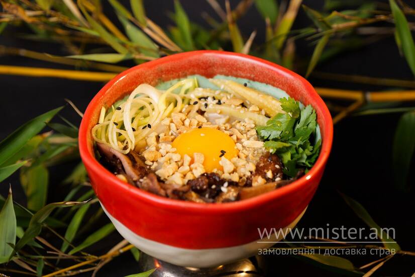 Локшина удон/соба на вибір, яловичина, кукурудза, зелена цибуля, місо паста, горіховий соус, соус чилі-часник, спайсі масло, кунжут, яєчний жовток, арахіс, зелень.