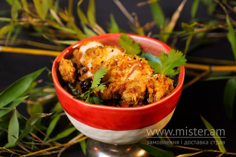Локшина удон/соба на вибір, хрустка курка, мікс овочів, соєвий соус, мірін, світ чилі, спайсі масло, кунжут, унагі, зелень.