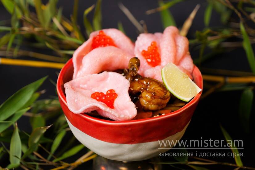 Локшина удон/соба на вибір, бейбі восьминіг, креветка, кальмар, мідії, кокосове молоко, соєвий соус, мірін, світ чилі, кунжут, рисові чіпси, ікура, дикий мед, лайм.