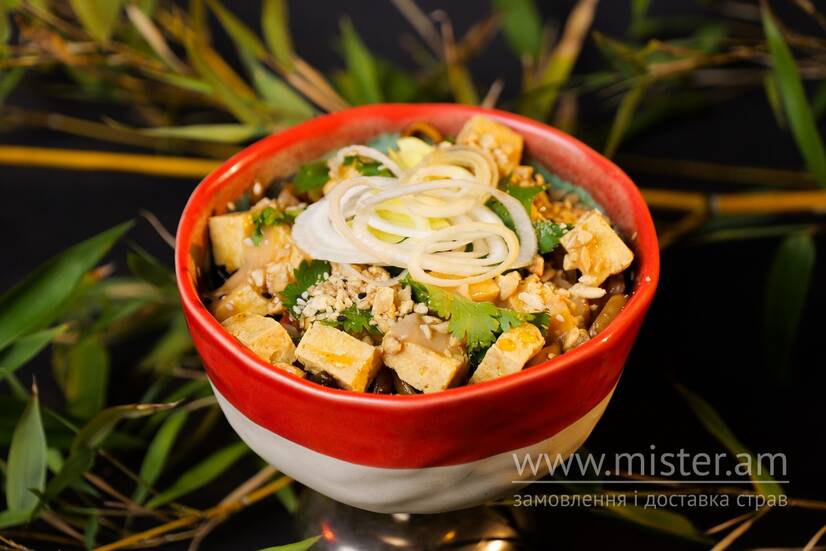 Локшина удон/соба на вибір, смажений тофу, мікс овочів, соєвий соус, мірін, горіховий соус, кунжут, арахіс, дикий мед, зелень, зелена цибуля.