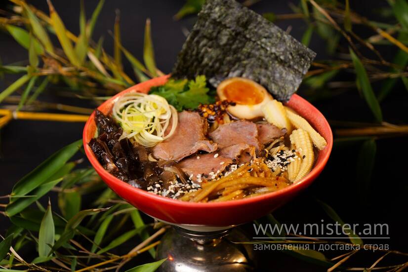 Бульйон, яєчна локшина, телятина, гриби муер, мариноване яйце, гарбуз канпіо, смажений бамбук, зелень, бебі кукурудза, норі, цибуля, кунжут, гостра олійка.