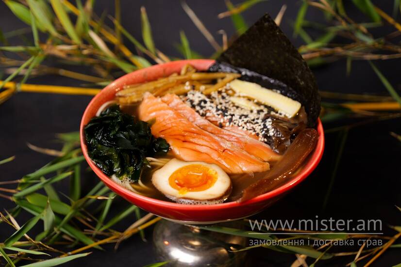 Бульйон даші, яєчна локшина, лосось, гриби муер, мариноване яйце, гарбуз канпіо, вакаме, смажений бамбук, бейбі кукурудза зелень, норі, кунжут, гостра олійка.