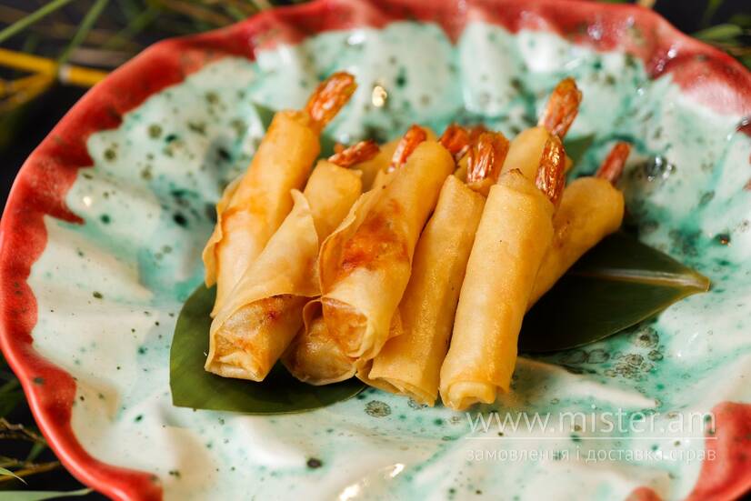 Засмажені до хрусту в рисовому папері 10 великих креветок, подаються з соусом чімічурі, диким медом та лаймом.