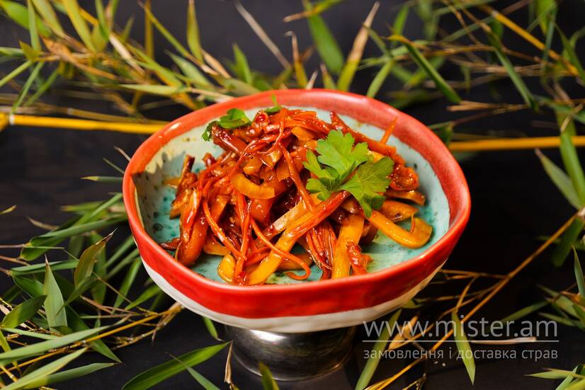 Салат з копченими свиними вушками, морквою та болгарським перцем у гострому соусі.