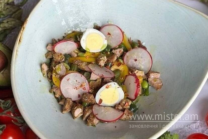 Холодник на айрані — це справжній кулінарний порятунок у спеку. Холодний, свіжий, злегка кислуватий— поєднує в собі ніжність айрану, хрумкість свіжих овочів та легкість ароматної зелені. Огірочки, редиска, болгарський перець , яйця, шматочки курочки, квасоля стручкова, боби едемаме , шпинат свіжий — усе це заливається прохолодним айраном, який надає страві оксамитової текстури та легкого освіжаючого смаку.Доповнюють смак пластівці чилі, що додають легкої пікантності страві.