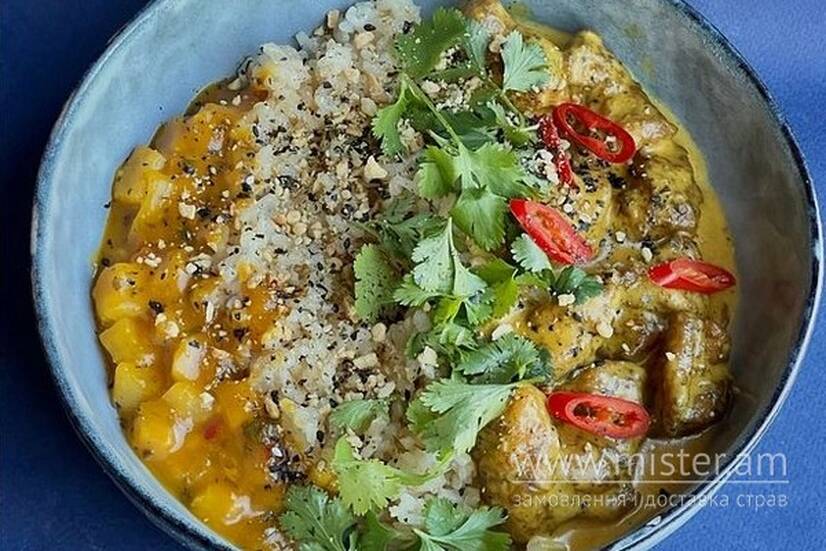 Тікка - масала – це соковите куряче бедро в ароматному вершковому соусі зі спеціями. Подається з ніжним рисом у кокосових вершках, пікантним чатні з груші та манго. Страву доповнює свіжа кінза і гострий перець чилі для яскравого смаку.