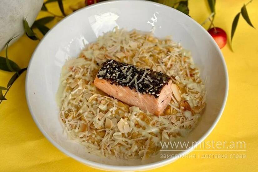 Кремова орзо паста у гарбузовому соусі з обсмаженим лососем, пармезаном і краплею лимонного перцю . Баланс ніжності, солодкості та морської свіжості в одній страві.
