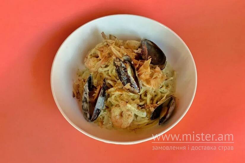 Спагетті, зварені до досконалого аль денте, в ніжному вершковому соусі на основі крем-сиру з ароматом свіжого кропу, петрушки, м’яти та пікантної нотки часнику. Асорті морепродуктів — ніжні креветки, кальмари та мідії — надають страві смаку справжнього моря. Завершує композицію витончена стружка тунця, що тане на гарячій пасті, додаючи делікатної глибини та благородного післясмаку. Кожна виделка — гармонія ніжності, свіжості та вишуканості.