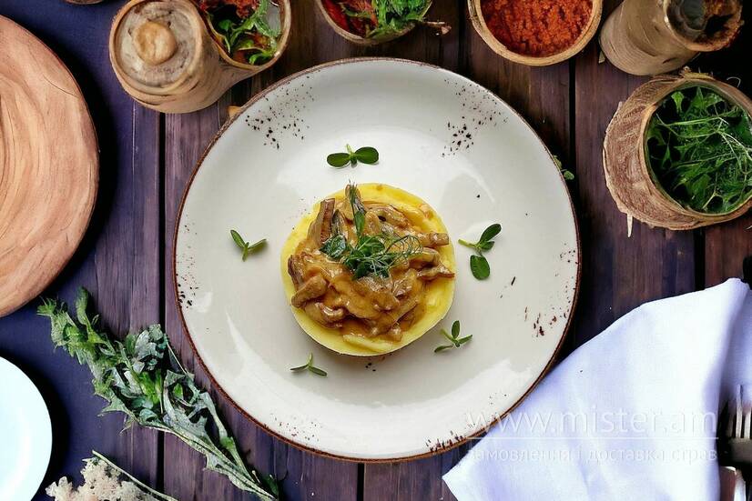 Яловичина, топлена в вершковому соусі з гірчицею, цибулею, шампіньйонами і маринованим огірком, з картопляним пюре.