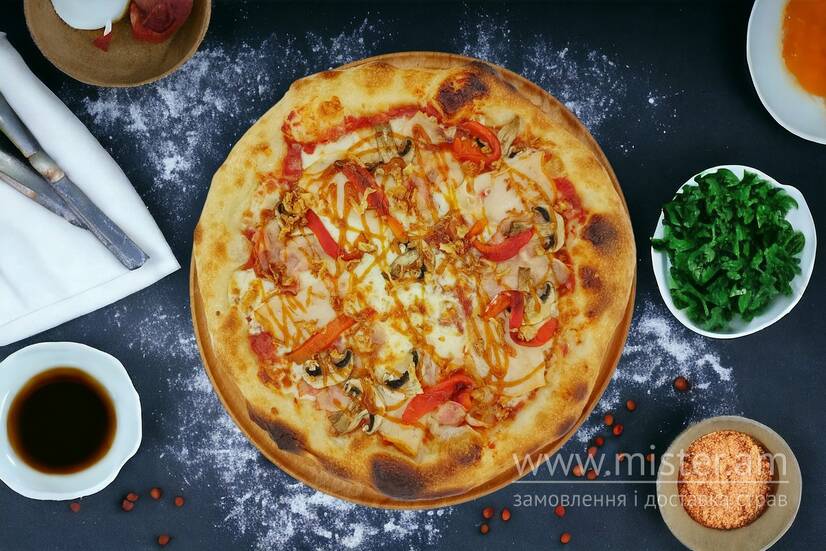 Томатний соус, сир моцарела, грудинка копчена, куряче філе, перець гриль, соус барбекю, печериці, цибуля кріспі, оливкова олія.
