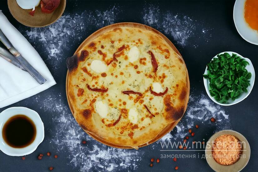Вершковий соус, сир моцарела, сир дорблю, крем-сир пармезан, в`ялені томати, оливкова олія.