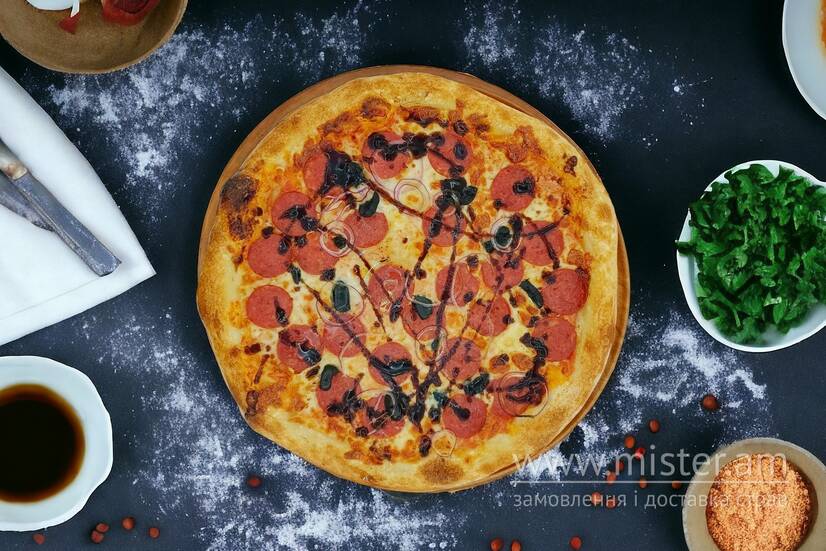 Томатний соус, сир моцарела, папероні, крем-сир, цибуля синя, оливки, соус унагі, оливкова олія.
