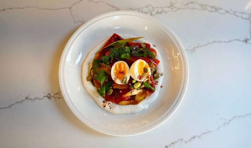 Перець, цукіні подаємо з томатною сальсою, лабне та мʼяким яйцем .