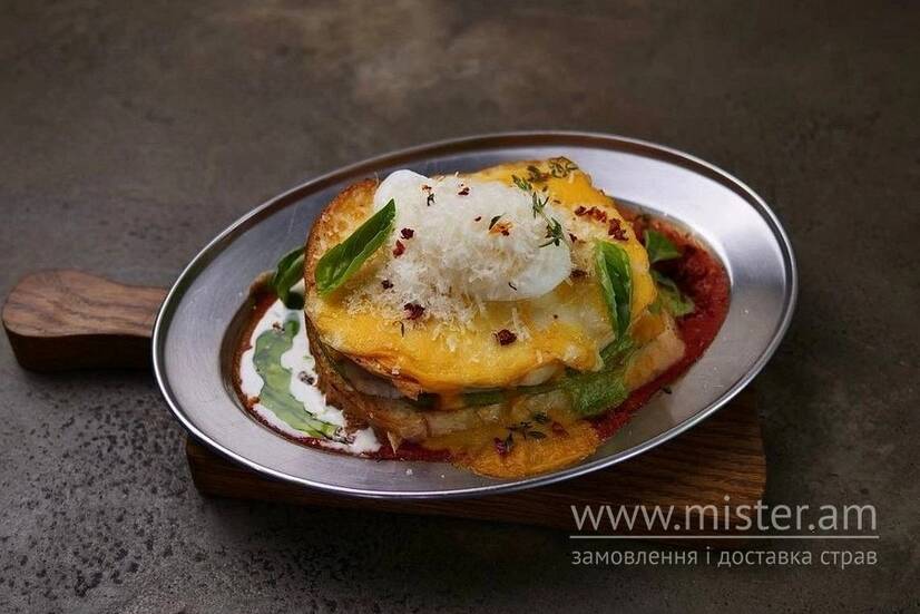 Бріош, курка сувід ,яйце пашот, сир моцарела та чеддер, йогуртовий соус(пікантний). Посипаємо пармезаном та травами, подаємо на соусі марінара.