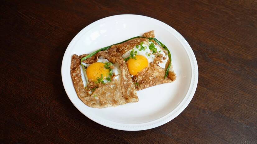 Всередині млинців: сир чеддер, томатна сальса, шинка, гірчичний соус та яйце оката.