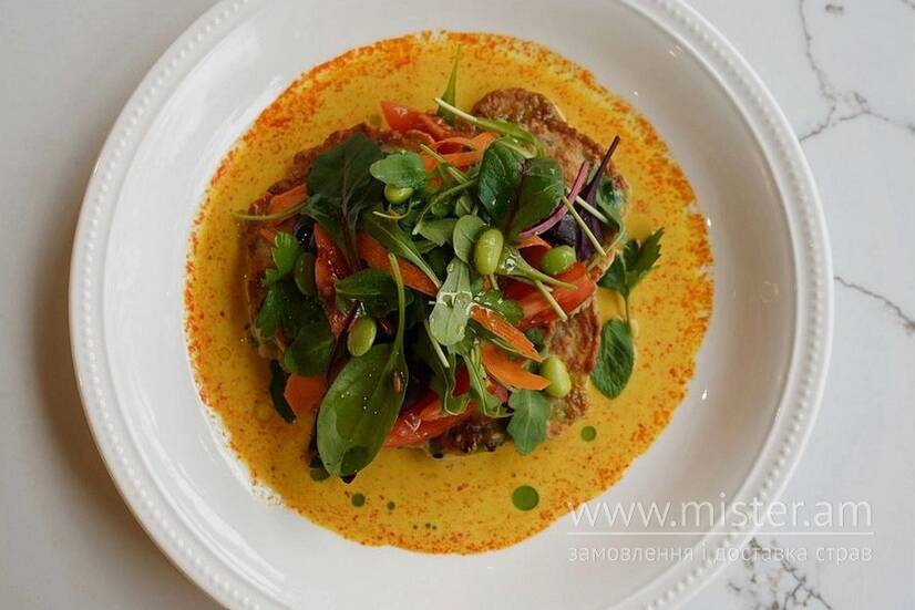 В основі панкейків рублені креветки, курячий фарш, броколі, яйце, кунжут, борошно. Подаємо на кокосовому соусі з міксом салату, бобами едамаме, чері, морквою та пряною олією.