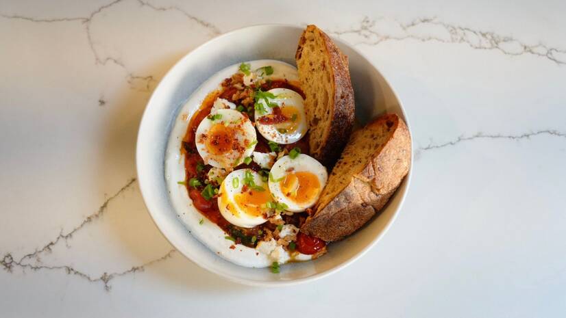 Томатний соус з болгарський перцем Доповнюємо сиром фета та мʼяким яйцем. Подаємо з зерновим хлібом.