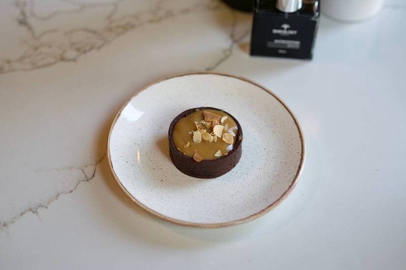 хрустка шоколадна підніжка та мигдальний грильяж в поєднанні з ніжним карамельним кремом.