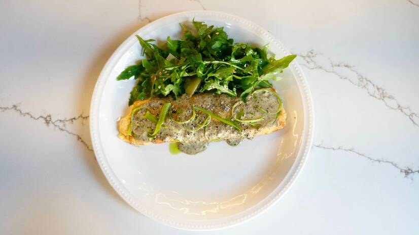 Омлет закручений у млинець з пармезаном, поливаємо трюфельним соусом, подаємо зі свіжою зеленню.