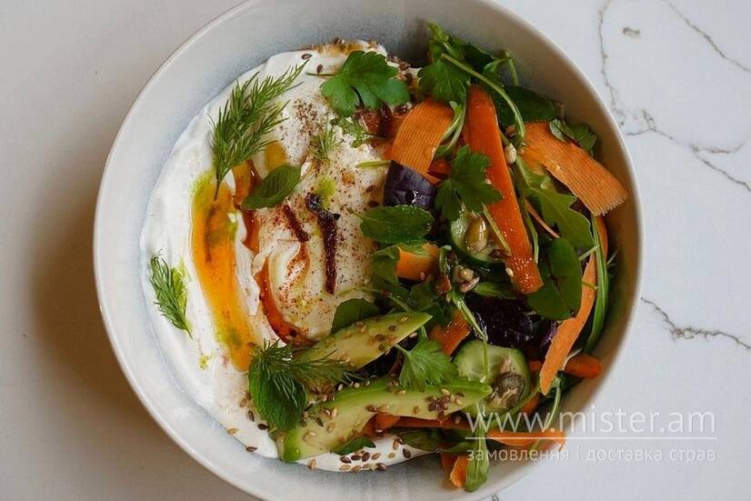 Яйця пашот подаємо з лабне, міксом салату, морквою, огірком, авокадо, свіжою зеленню. Заправляємо запашною та пряною олією. Подаємо з зерновим хлібом.
