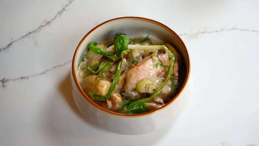Куряче бедро, тушковане з грибами та картоплею у вершково-гірчичному соусі.