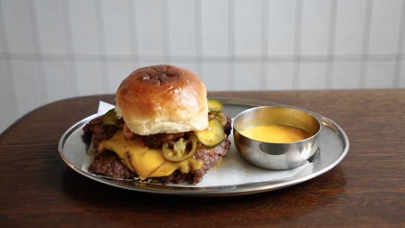 Булочка бріош, дві яловичі котлети з витриманого мʼяса, сир чедер, листя салату, кетчуп, гірчиця, огірки пікулі, біла цибуля, перець халапеньйо. Подаємо з сирним соусом.