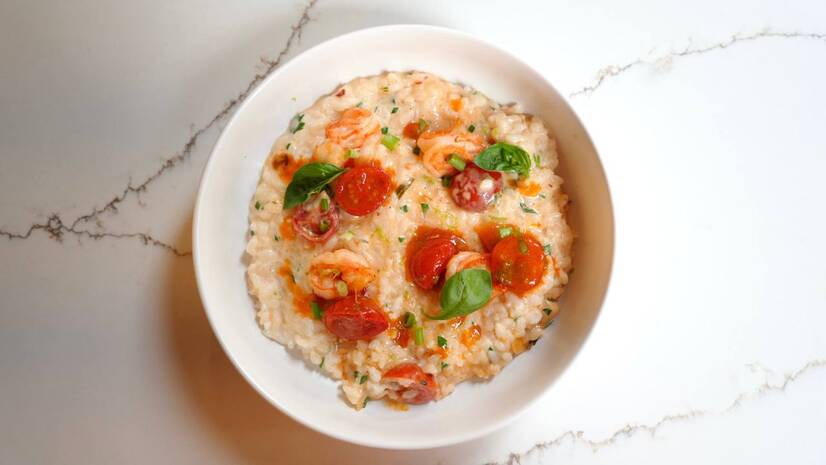 Вершковий рис подаємо з томатною сальсою та грильованими креветками.
