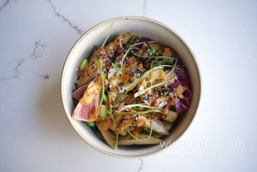 Подаємо з міксом салату, смаженою картоплею, грильованим тунцем, печеним перцем, маринованою червоною цибулею та мʼяким яйцем. Поливаємо соусом спайсі майо та фурікаке.