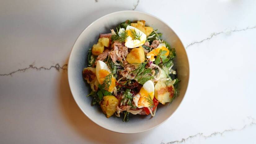 Тунець консервований, мікс салату, капуста напа, томати чері, грильована шпарагівка, мʼяке яйце та печена картопля.Заправляємо салатним соусом та гірчицею .