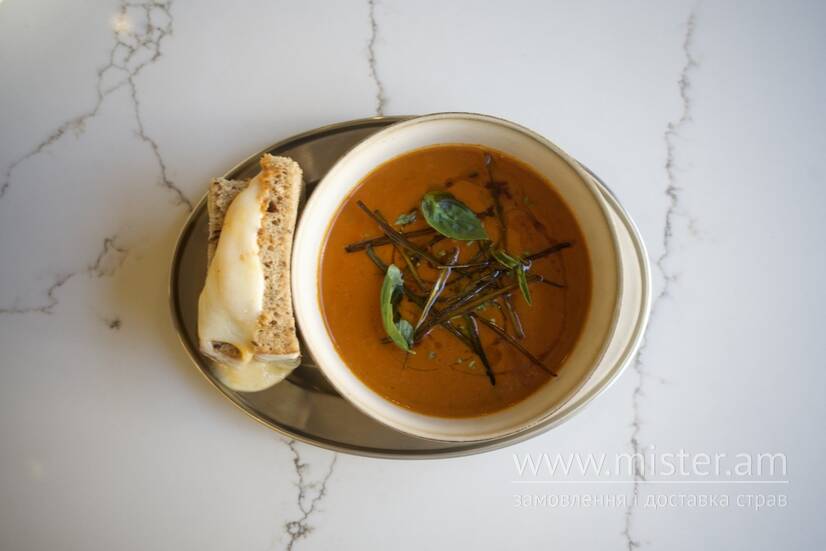 В основі супа: печені томати, перець, морква, цибуля часник та томати пелаті. Додаємо свіжий базилік та тимʼян . Подаємо з кріспі цибулею порей, базиліком та сирним тостом.