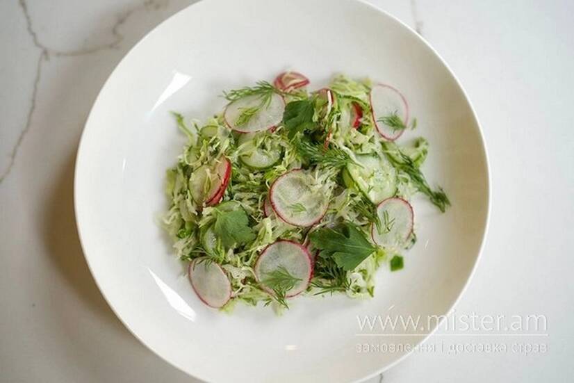 Молода капуста, огірок, редиска, зелена цибуля, зелень, заправлений запашною олією і яблучним оцтом.