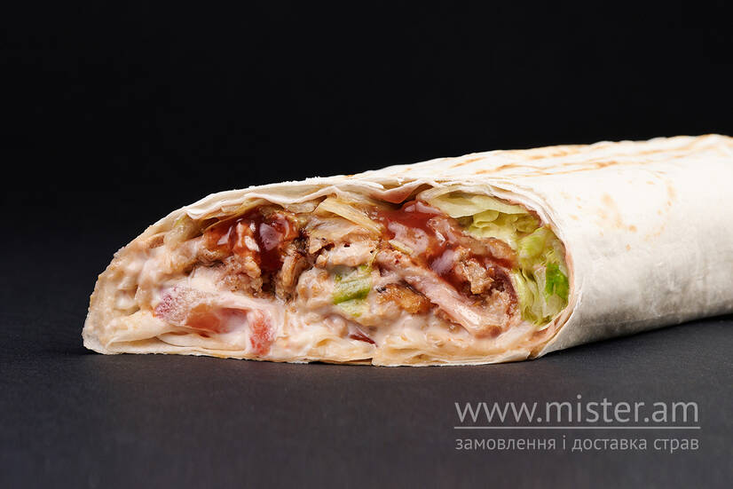 Лаваш, помідор, салат "Айсберг", цибуля, м`ясо - свинина, кетчуп та майонез.