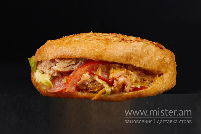 Булка, помідор, салат "Айсберг", цибуля, м`ясо: свинина/курятина/мікс, соус гострий/негострий/напівгострий/кетчуп та майонез.